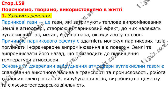 Пояснюємо, творимо, використовуємо в житті 1. Закінчіть речення: Парникові гази — це гази, які затримують теплове випромінювання Землі в атмосфері, створюючи парниковий ефект, до них належать вуглекислий газ, метан, водяна пара, оксиди азоту та озон. Причиною парникового ефекту є здатність молекул парникових газів поглинати інфрачервоне випромінювання від поверхні Землі та випромінювати його назад, що призводить до підвищення температури атмосфери. Основними джерелами забруднення атмосфери вуглекислим газом є спалювання викопного палива в транспорті та промисловості, робота теплових електростанцій, вирубування лісів, виробництво цементу та сільськогосподарська діяльність.