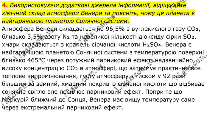 4. Використовуючи додаткові джерела інформації, відшукайте хімічний склад атмосфери Венери та поясніть, чому ця планета є найгарячішою планетою Сонячної системи. Атмосфера Венери складається на 96,5% з вуглекислого газу CO₂, близько 3,5% азоту N₂ та невеликої кількості діоксиду сірки SO₂, хмари складаються з крапель сірчаної кислоти H₂SO₄. Венера є найгарячішою планетою Сонячної системи з температурою поверхні близько 465°C через потужний парниковий ефект, надзвичайно високу концентрацію CO₂ в атмосфері, що затримує практично все теплове випромінювання, густу атмосферу з тиском у 92 рази більшим за земний, хмарний покрив із сірчаної кислоти що відбиває сонячне світло але посилює парниковий ефект. Попри те що Меркурій ближчий до Сонця, Венера має вищу температуру саме через екстремальний парниковий ефект.