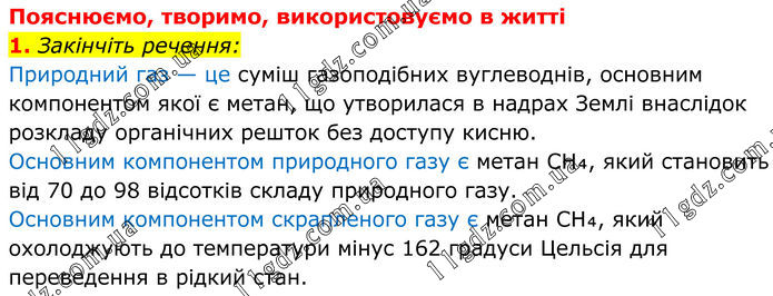Пояснюємо, творимо, використовуємо в житті 1. Закінчіть речення: Природний газ — це суміш газоподібних вуглеводнів, основним компонентом якої є метан, що утворилася в надрах Землі внаслідок розкладу органічних решток без доступу кисню. Основним компонентом природного газу є метан CH₄, який становить від 70 до 98 відсотків складу природного газу. Основним компонентом скрапленого газу є метан CH₄, який охолоджують до температури мінус 162 градуси Цельсія для переведення в рідкий стан.