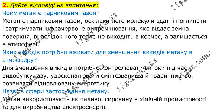 2. Дайте відповіді на запитання: Чому метан є парниковим газом? Метан є парниковим газом, оскільки його молекули здатні поглинати і затримувати інфрачервоне випромінювання, яке віддає земна поверхня, внаслідок чого тепло не виходить в космос, а залишається в атмосфері. Яких заходів потрібно вживати для зменшення викидів метану в атмосферу? Для зменшення викидів потрібно контролювати витоки під час видобутку газу, удосконалювати сміттєзвалища й тваринництво, розвивати відновлювану енергетику. Назвіть сфери застосування метану. Метан використовують як паливо, сировину в хімічній промисловості та для виробництва електроенергії.