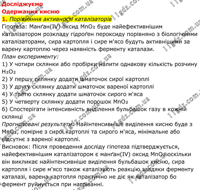 Досліджуємо Одержання кисню 1. Порівняння активності каталізаторів Гіпотеза: Манґан(IV) оксид MnO₂ буде найефективнішим каталізатором розкладу гідроґен пероксиду порівняно з біологічними каталізаторами, сира картопля і сире м'ясо будуть активнішими за варену картоплю через наявність ферменту каталази. План експерименту: 1) У чотири склянки або пробірки налити однакову кількість розчину H₂O₂ 2) У першу склянку додати шматочок сирої картоплі 3) У другу склянку додати шматочок вареної картоплі 4) У третю склянку додати шматочок сирого м'яса 5) У четверту склянку додати порошок MnO₂ 6) Спостерігати інтенсивність виділення бульбашок газу в кожній склянці Прогнозовані результати: Найінтенсивніше виділення кисню буде з MnO₂, помірне з сирої картоплі та сирого м'яса, мінімальне або відсутнє з вареної картоплі. Висновок: Після проведення досліду гіпотеза підтверджується, найефективнішим каталізатором є манґан(IV) оксид MnO₂ оскільки він викликає найінтенсивніше виділення бульбашок кисню, сира картопля і сире м'ясо також каталізують реакцію завдяки ферменту каталазі, варена картопля практично не діє як каталізатор бо фермент руйнується при нагріванні.