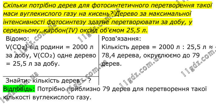 Скільки потрібно дерев для фотосинтетичного перетворення такої маси вуглекислого газу на кисень? Дерево за максимальної інтенсивності фотосинтезу здатне перетворювати за добу, у середньому, карбон(IV) оксид об'ємом 25,5 л. Відомо: V(CO₂) від родини = 2000 л за добу, V(CO₂) одне дерево = 25,5 л за добу. Розв'язання: Кількість дерев = 2000 л : 25,5 л ≈ 78,4 дерева, округлюємо до 79 дерев. Знайти: кількість дерев – ? Відповідь: Потрібно приблизно 79 дерев для перетворення такої кількості вуглекислого газу.