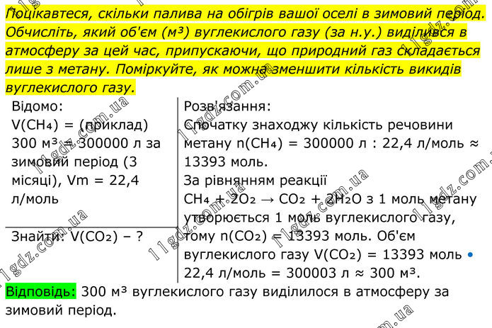 Поцікавтеся, скільки палива на обігрів вашої оселі в зимовий період. Обчисліть, який об'єм (м³) вуглекислого газу (за н.у.) виділився в атмосферу за цей час, припускаючи, що природний газ складається лише з метану. Поміркуйте, як можна зменшити кількість викидів вуглекислого газу. Відомо: V(CH₄) = (приклад) 300 м³ = 300000 л за зимовий період (3 місяці), Vm = 22,4 л/моль Розв'язання: Спочатку знаходжу кількість речовини метану n(CH₄) = 300000 л : 22,4 л/моль ≈ 13393 моль. За рівнянням реакції CH₄ + 2O₂ → CO₂ + 2H₂O з 1 моль метану утворюється 1 моль вуглекислого газу, тому n(CO₂) = 13393 моль. Об'єм вуглекислого газу V(CO₂) = 13393 моль • 22,4 л/моль = 300003 л ≈ 300 м³. Знайти: V(CO₂) – ? Відповідь: 300 м³ вуглекислого газу виділилося в атмосферу за зимовий період.