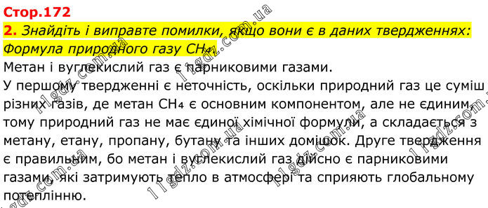 2. Знайдіть і виправте помилки, якщо вони є в даних твердженнях: Формула природного газу CH₄. Метан і вуглекислий газ є парниковими газами. У першому твердженні є неточність, оскільки природний газ це суміш різних газів, де метан CH₄ є основним компонентом, але не єдиним, тому природний газ не має єдиної хімічної формули, а складається з метану, етану, пропану, бутану та інших домішок. Друге твердження є правильним, бо метан і вуглекислий газ дійсно є парниковими газами, які затримують тепло в атмосфері та сприяють глобальному потеплінню.