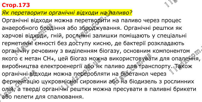 Як перетворити органічні відходи на паливо? Органічні відходи можна перетворити на паливо через процес анаеробного бродіння або зброджування. Органічні рештки як харчові відходи, гній, рослинні залишки поміщають у спеціальні герметичні ємності без доступу кисню, де бактерії розкладають органічну речовину з виділенням біогазу, основним компонентом якого є метан CH₄, цей біогаз можна використовувати для опалення, виробництва електроенергії або як паливо для транспорту. Також органічні відходи можна переробляти на біоетанол через ферментацію цукровмісної сировини або на біодизель з рослинних олій, а тверді органічні рештки можна пресувати в паливні брикети або пелети для спалювання.