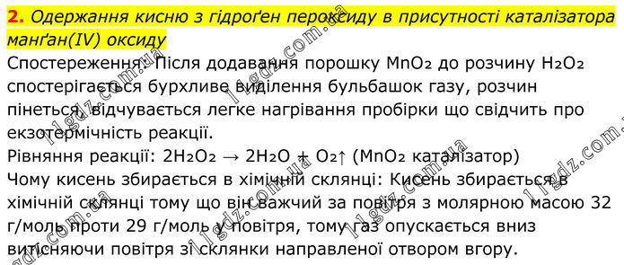 2. Одержання кисню з гідроґен пероксиду в присутності каталізатора манґан(IV) оксиду Спостереження: Після додавання порошку MnO₂ до розчину H₂O₂ спостерігається бурхливе виділення бульбашок газу, розчин пінеться, відчувається легке нагрівання пробірки що свідчить про екзотермічність реакції. Рівняння реакції: 2H₂O₂ → 2H₂O + O₂↑ (MnO₂ каталізатор) Чому кисень збирається в хімічній склянці: Кисень збирається в хімічній склянці тому що він важчий за повітря з молярною масою 32 г/моль проти 29 г/моль у повітря, тому газ опускається вниз витісняючи повітря зі склянки направленої отвором вгору.