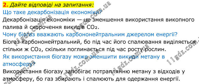 2. Дайте відповіді на запитання: Що таке декарбонізація економіки? Декарбонізація економіки — це зменшення використання викопного палива й скорочення викидів CO₂. Чому біогаз вважають карбононейтральним джерелом енергії? Біогаз карбононейтральний, бо під час його спалювання виділяється стільки ж CO₂, скільки поглинається під час росту рослин. Як використання біогазу може зменшити викиди метану в атмосферу? Використання біогазу запобігає потраплянню метану з відходів у атмосферу, бо газ збирають і спалюють для одержання енергії.