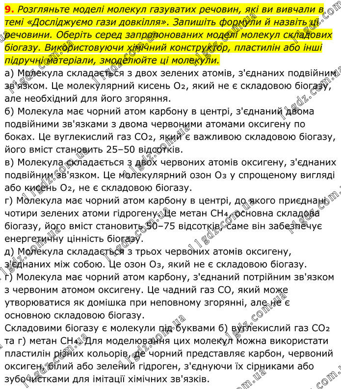 9. Розгляньте моделі молекул газуватих речовин, які ви вивчали в темі «Досліджуємо гази довкілля». Запишіть формули й назвіть ці речовини. Оберіть серед запропонованих моделі молекул складових біогазу. Використовуючи хімічний конструктор, пластилін або інші підручні матеріали, змоделюйте ці молекули. а) Молекула складається з двох зелених атомів, з'єднаних подвійним зв'язком. Це молекулярний кисень O₂, який не є складовою біогазу, але необхідний для його згоряння. б) Молекула має чорний атом карбону в центрі, з'єднаний двома подвійними зв'язками з двома червоними атомами оксигену по боках. Це вуглекислий газ CO₂, який є важливою складовою біогазу, його вміст становить 25–50 відсотків. в) Молекула складається з двох червоних атомів оксигену, з'єднаних подвійним зв'язком. Це молекулярний озон O₃ у спрощеному вигляді або кисень O₂, не є складовою біогазу. г) Молекула має чорний атом карбону в центрі, до якого приєднані чотири зелених атоми гідрогену. Це метан CH₄, основна складова біогазу, його вміст становить 50–75 відсотків, саме він забезпечує енергетичну цінність біогазу. д) Молекула складається з трьох червоних атомів оксигену, з'єднаних між собою. Це озон O₃, який не є складовою біогазу. г) Молекула має чорний атом карбону, з'єднаний потрійним зв'язком з червоним атомом оксигену. Це чадний газ CO, який може утворюватися як домішка при неповному згорянні, але не є основною складовою біогазу. Складовими біогазу є молекули під буквами б) вуглекислий газ CO₂ та г) метан CH₄. Для моделювання цих молекул можна використати пластилін різних кольорів, де чорний представляє карбон, червоний оксиген, білий або зелений гідроген, з'єднуючи їх сірниками або зубочистками для імітації хімічних зв'язків.