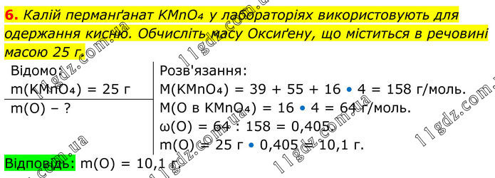 6. Калій перманґанат KMnO₄ у лабораторіях використовують для одержання кисню. Обчисліть масу Оксиґену, що міститься в речовині масою 25 г. Відомо: m(KMnO₄) = 25 г Розв'язання: M(KMnO₄) = 39 + 55 + 16 • 4 = 158 г/моль. M(O в KMnO₄) = 16 • 4 = 64 г/моль. ω(O) = 64 : 158 = 0,405. m(O) = 25 г • 0,405 = 10,1 г. m(O) – ? Відповідь: m(O) = 10,1 г.
