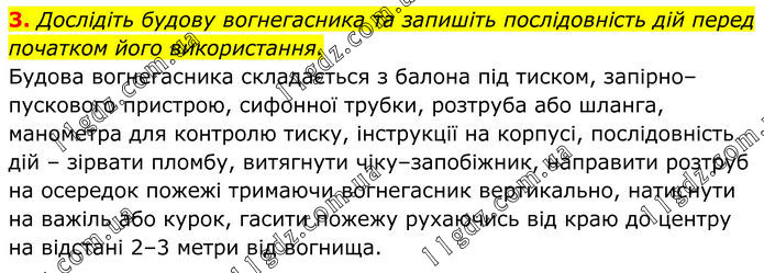 3. Дослідіть будову вогнегасника та запишіть послідовність дій перед початком його використання. Будова вогнегасника складається з балона під тиском, запірно–пускового пристрою, сифонної трубки, розтруба або шланга, манометра для контролю тиску, інструкції на корпусі, послідовність дій – зірвати пломбу, витягнути чіку–запобіжник, направити розтруб на осередок пожежі тримаючи вогнегасник вертикально, натиснути на важіль або курок, гасити пожежу рухаючись від краю до центру на відстані 2–3 метри від вогнища.