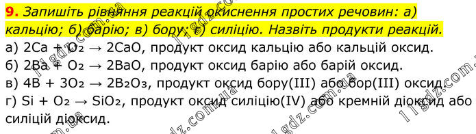 9. Запишіть рівняння реакцій окиснення простих речовин: а) кальцію; б) барію; в) бору; г) силіцію. Назвіть продукти реакцій. а) 2Ca + O₂ → 2CaO, продукт оксид кальцію або кальцій оксид. б) 2Ba + O₂ → 2BaO, продукт оксид барію або барій оксид. в) 4B + 3O₂ → 2B₂O₃, продукт оксид бору(III) або бор(III) оксид. г) Si + O₂ → SiO₂, продукт оксид силіцію(IV) або кремній діоксид або силіцій діоксид.