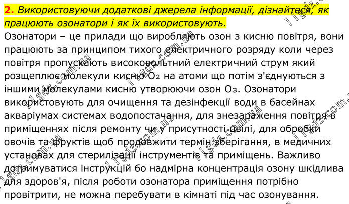 2. Використовуючи додаткові джерела інформації, дізнайтеся, як працюють озонатори і як їх використовують. Озонатори – це прилади що виробляють озон з кисню повітря, вони працюють за принципом тихого електричного розряду коли через повітря пропускають високовольтний електричний струм який розщеплює молекули кисню O₂ на атоми що потім з'єднуються з іншими молекулами кисню утворюючи озон O₃. Озонатори використовують для очищення та дезінфекції води в басейнах акваріумах системах водопостачання, для знезараження повітря в приміщеннях після ремонту чи у присутності цвілі, для обробки овочів та фруктів щоб продовжити термін зберігання, в медичних установах для стерилізації інструментів та приміщень. Важливо дотримуватися інструкцій бо надмірна концентрація озону шкідлива для здоров'я, після роботи озонатора приміщення потрібно провітрити, не можна перебувати в кімнаті під час озонування.