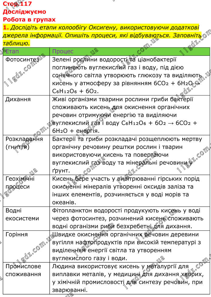 Досліджуємо Робота в групах 1. Дослідіть етапи колообігу Оксигену, використовуючи додаткові джерела інформації. Опишіть процеси, які відбуваються. Заповніть таблицю. Етап Процес Фотосинтез Зелені рослини водорості та ціанобактерії поглинають вуглекислий газ і воду, під дією сонячного світла утворюють глюкозу та виділяють кисень у атмосферу за рівнянням 6CO₂ + 6H₂O → C₆H₁₂O₆ + 6O₂. Дихання Живі організми тварини рослини гриби бактерії споживають кисень для окиснення органічних речовин отримуючи енергію та виділяючи вуглекислий газ і воду C₆H₁₂O₆ + 6O₂ → 6CO₂ + 6H₂O + енергія. Розкладання (гниття) Бактерії та гриби розкладачі розщеплюють мертву органічну речовину рештки рослин і тварин використовуючи кисень та повертаючи вуглекислий газ воду та мінеральні речовини у ґрунт. Геохімічні процеси Кисень бере участь у вивітрюванні гірських порід окисненні мінералів утворенні оксидів заліза та інших елементів, розчиняється у воді морів та океанів. Водні екосистеми Фітопланктон водорості продукують кисень у воді через фотосинтез, розчинений кисень споживають водні організми риби безхребетні для дихання. Горіння Швидке окиснення органічних речовин деревини вугілля нафтопродуктів при високій температурі з виділенням енергії світла та утворенням вуглекислого газу і води. Промислове споживання Людина використовує кисень у металургії для виплавки металів, у медицині для дихання хворих, у хімічній промисловості для синтезу речовин, при зварюванні.