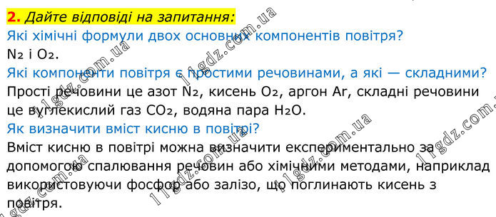 2. Дайте відповіді на запитання: Які хімічні формули двох основних компонентів повітря? N₂ і O₂. Які компоненти повітря є простими речовинами, а які — складними? Прості речовини це азот N₂, кисень O₂, аргон Ar, складні речовини це вуглекислий газ CO₂, водяна пара H₂O. Як визначити вміст кисню в повітрі? Вміст кисню в повітрі можна визначити експериментально за допомогою спалювання речовин або хімічними методами, наприклад використовуючи фосфор або залізо, що поглинають кисень з повітря.