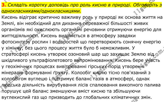 3. Складіть коротку доповідь про роль кисню в природі. Обговоріть з однокласниками/однокласницями. Кисень відіграє критично важливу роль у природі як основа життя на Землі, він необхідний для дихання переважної більшості живих організмів які окислюють органічні речовини отримуючи енергію для життєдіяльності. Кисень виділяється в атмосферу завдяки фотосинтезу рослин і водоростей що перетворюють сонячну енергію у хімічну, без цього процесу життя було б неможливим. У стратосфері кисень утворює озоновий шар що захищає Землю від шкідливого ультрафіолетового випромінювання. Кисень бере участь у геохімічних процесах вивітрюванні гірських порід утворенні мінералів формуванні ґрунту. Колообіг кисню тісно пов'язаний з колообігом вуглецю і підтримує баланс газів в атмосфері, однак людська діяльність вирубування лісів спалювання викопного палива порушує цей баланс зменшуючи вміст кисню та збільшуючи вуглекислий газ що призводить до глобальних кліматичних змін.
