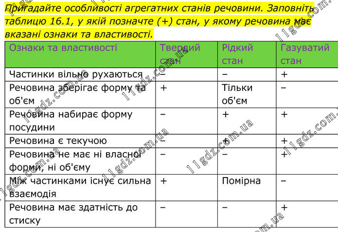 Пригадайте особливості агрегатних станів речовини. Заповніть таблицю 16.1, у якій позначте (+) стан, у якому речовина має вказані ознаки та властивості. Ознаки та властивості Твердий стан Рідкий стан Газуватий стан Частинки вільно рухаються – – + Речовина зберігає форму та об'єм + Тільки об'єм – Речовина набирає форму посудини – + + Речовина є текучою – + + Речовина не має ні власної форми, ні об'єму – – + Між частинками існує сильна взаємодія + Помірна – Речовина має здатність до стиску – – +