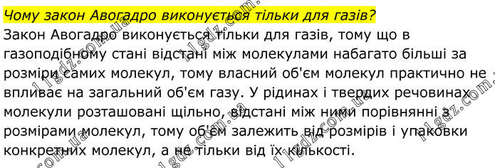 Чому закон Авогадро виконується тільки для газів? Закон Авогадро виконується тільки для газів, тому що в газоподібному стані відстані між молекулами набагато більші за розміри самих молекул, тому власний об'єм молекул практично не впливає на загальний об'єм газу. У рідинах і твердих речовинах молекули розташовані щільно, відстані між ними порівнянні з розмірами молекул, тому об'єм залежить від розмірів і упаковки конкретних молекул, а не тільки від їх кількості.