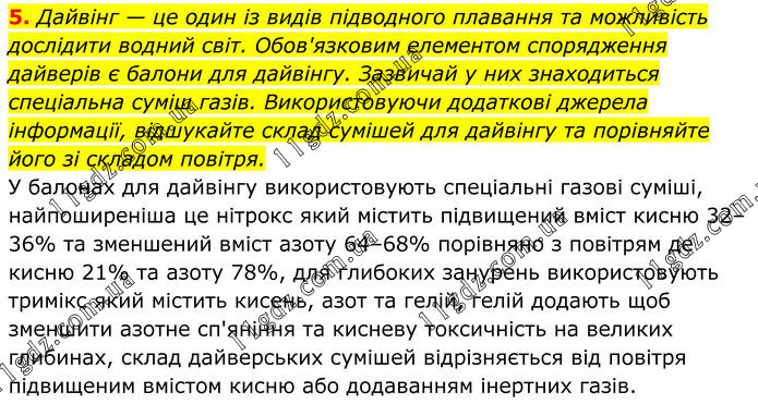5. Дайвінг — це один із видів підводного плавання та можливість дослідити водний світ. Обов'язковим елементом спорядження дайверів є балони для дайвінгу. Зазвичай у них знаходиться спеціальна суміш газів. Використовуючи додаткові джерела інформації, відшукайте склад сумішей для дайвінгу та порівняйте його зі складом повітря. У балонах для дайвінгу використовують спеціальні газові суміші, найпоширеніша це нітрокс який містить підвищений вміст кисню 32–36% та зменшений вміст азоту 64–68% порівняно з повітрям де кисню 21% та азоту 78%, для глибоких занурень використовують тримікс який містить кисень, азот та гелій, гелій додають щоб зменшити азотне сп'яніння та кисневу токсичність на великих глибинах, склад дайверських сумішей відрізняється від повітря підвищеним вмістом кисню або додаванням інертних газів.
