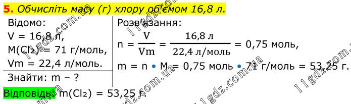 5. Обчисліть масу (г) хлору об'ємом 16,8 л. Відомо: V = 16,8 л, M(Cl₂) = 71 г/моль, Vm = 22,4 л/моль. Розв'язання: n = V/Vm = (16,8 л )/( 22,4 л/моль) = 0,75 моль, m = n • M = 0,75 моль • 71 г/моль = 53,25 г. Знайти: m – ? Відповідь: m(Cl₂) = 53,25 г.
