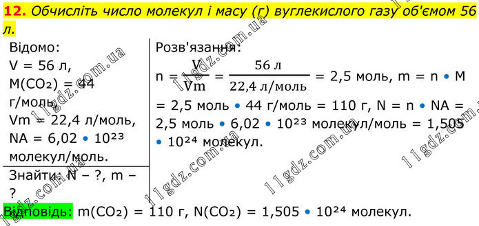 12. Обчисліть число молекул і масу (г) вуглекислого газу об'ємом 56 л. Відомо: V = 56 л, M(CO₂) = 44 г/моль, Vm = 22,4 л/моль, NA = 6,02 • 10²³ молекул/моль. Розв'язання: n = V/(Vm ) = (56 л )/(22,4 л/моль ) = 2,5 моль, m = n • M = 2,5 моль • 44 г/моль = 110 г, N = n • NA = 2,5 моль • 6,02 • 10²³ молекул/моль = 1,505 • 10²⁴ молекул. Знайти: N – ?, m – ? Відповідь: m(CO₂) = 110 г, N(CO₂) = 1,505 • 10²⁴ молекул.