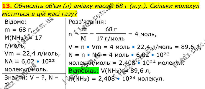 13. Обчисліть об'єм (л) аміаку масою 68 г (н.у.). Скільки молекул міститься в цій масі газу? Відомо: m = 68 г, M(NH₃) = 17 г/моль, Vm = 22,4 л/моль, NA = 6,02 • 10²³ молекул/моль. Розв'язання: n = m/(M ) = (68 г)/(17 г/моль ) = 4 моль, V = n • Vm = 4 моль • 22,4 л/моль = 89,6 л, N = n • NA = 4 моль • 6,02 • 10²³ молекул/моль = 2,408 • 10²⁴ молекул. Відповідь: V(NH₃) = 89,6 л, N(NH₃) = 2,408 • 10²⁴ молекул. Знайти: V – ?, N – ?