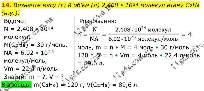 14. Визначте масу (г) й об'єм (л) 2,408 • 10²⁴ молекул етану C₂H₆ (н.у.). Відомо: N = 2,408 • 10²⁴ молекул, M(C₂H₆) = 30 г/моль, NA = 6,02 • 10²³ молекул/моль, Vm = 22,4 л/моль. Розв'язання: n = N/(NA ) = (2,408 • 10²⁴ молекул )/(6,02 • 10²³ молекул/моль ) = 4 моль, m = n • M = 4 моль • 30 г/моль = 120 г, V = n • Vm = 4 моль • 22,4 л/моль = 89,6 л. Знайти: m – ?, V – ? Відповідь: m(C₂H₆) = 120 г, V(C₂H₆) = 89,6 л.