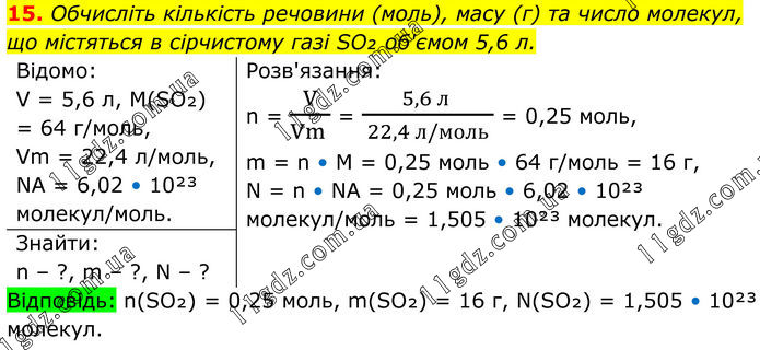 15. Обчисліть кількість речовини (моль), масу (г) та число молекул, що містяться в сірчистому газі SO₂ об'ємом 5,6 л. Відомо: V = 5,6 л, M(SO₂) = 64 г/моль, Vm = 22,4 л/моль, NA = 6,02 • 10²³ молекул/моль. Розв'язання: n = V/(Vm ) = (5,6 л )/( 22,4 л/моль ) = 0,25 моль, m = n • M = 0,25 моль • 64 г/моль = 16 г, N = n • NA = 0,25 моль • 6,02 • 10²³ молекул/моль = 1,505 • 10²³ молекул. Знайти: n – ?, m – ?, N – ? Відповідь: n(SO₂) = 0,25 моль, m(SO₂) = 16 г, N(SO₂) = 1,505 • 10²³ молекул.