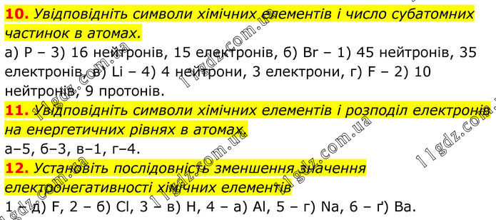 10. Увідповідніть символи хімічних елементів і число субатомних частинок в атомах. а) P – 3) 16 нейтронів, 15 електронів, б) Br – 1) 45 нейтронів, 35 електронів, в) Li – 4) 4 нейтрони, 3 електрони, г) F – 2) 10 нейтронів, 9 протонів. 11. Увідповідніть символи хімічних елементів і розподіл електронів на енергетичних рівнях в атомах. a–5, б–3, в–1, г–4. 12. Установіть послідовність зменшення значення електронегативності хімічних елементів 1 – д) F, 2 – б) Cl, 3 – в) H, 4 – а) Al, 5 – г) Na, 6 – ґ) Ba.
