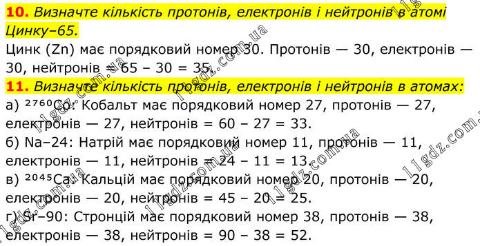 10. Визначте кількість протонів, електронів і нейтронів в атомі Цинку–65. Цинк (Zn) має порядковий номер 30. Протонів — 30, електронів — 30, нейтронів = 65 – 30 = 35. 11. Визначте кількість протонів, електронів і нейтронів в атомах: а) ²⁷⁶⁰Co: Кобальт має порядковий номер 27, протонів — 27, електронів — 27, нейтронів = 60 – 27 = 33. б) Na–24: Натрій має порядковий номер 11, протонів — 11, електронів — 11, нейтронів = 24 – 11 = 13. в) ²⁰⁴⁵Ca: Кальцій має порядковий номер 20, протонів — 20, електронів — 20, нейтронів = 45 – 20 = 25. г) Sr–90: Стронцій має порядковий номер 38, протонів — 38, електронів — 38, нейтронів = 90 – 38 = 52.