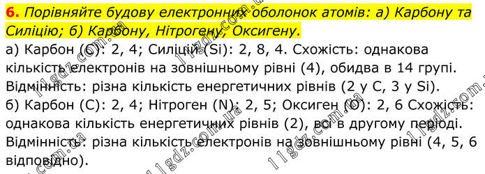 6. Порівняйте будову електронних оболонок атомів: а) Карбону та Силіцію; б) Карбону, Нітрогену, Оксигену. а) Карбон (C): 2, 4; Силіцій (Si): 2, 8, 4. Схожість: однакова кількість електронів на зовнішньому рівні (4), обидва в 14 групі. Відмінність: різна кількість енергетичних рівнів (2 у C, 3 у Si). б) Карбон (C): 2, 4; Нітроген (N): 2, 5; Оксиген (O): 2, 6 Схожість: однакова кількість енергетичних рівнів (2), всі в другому періоді. Відмінність: різна кількість електронів на зовнішньому рівні (4, 5, 6 відповідно).