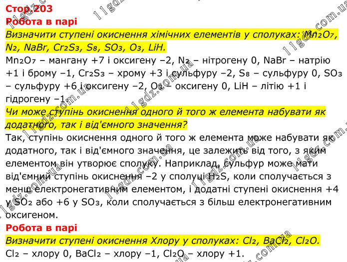 Робота в парі Визначити ступені окиснення хімічних елементів у сполуках: Mn₂O₇, N₂, NaBr, Cr₂S₃, S₈, SO₃, O₃, LiH. Mn₂O₇ – мангану +7 і оксигену –2, N₂ – нітрогену 0, NaBr – натрію +1 і брому –1, Cr₂S₃ – хрому +3 і сульфуру –2, S₈ – сульфуру 0, SO₃ – сульфуру +6 і оксигену –2, O₃ – оксигену 0, LiH – літію +1 і гідрогену –1. Чи може ступінь окиснення одного й того ж елемента набувати як додатного, так і від'ємного значення? Так, ступінь окиснення одного й того ж елемента може набувати як додатного, так і від'ємного значення, це залежить від того, з яким елементом він утворює сполуку. Наприклад, сульфур може мати від'ємний ступінь окиснення –2 у сполуці H₂S, коли сполучається з менш електронегативним елементом, і додатні ступені окиснення +4 у SO₂ або +6 у SO₃, коли сполучається з більш електронегативним оксигеном. Робота в парі Визначити ступені окиснення Хлору у сполуках: Cl₂, BaCl₂, Cl₂O. Cl₂ – хлору 0, BaCl₂ – хлору –1, Cl₂O – хлору +1.