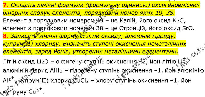 7. Складіть хімічні формули (формульну одиницю) оксигеновмісних бінарних сполук елементів, порядковий номер яких 19, 38. Елемент з порядковим номером 19 – це Калій, його оксид K₂O, елемент з порядковим номером 38 – це Стронцій, його оксид SrO. 8. Запишіть хімічні формули літій оксиду, алюміній гідриду, купрум(II) хлориду. Визначіть ступені окиснення неметалічних елементів, заряд йонів, утворених металічними елементами. Літій оксид Li₂O – оксигену ступінь окиснення –2, йон літію Li⁺, алюміній гідрид AlH₃ – гідрогену ступінь окиснення –1, йон алюмінію Al³⁺, купрум(II) хлорид CuCl₂ – хлору ступінь окиснення –1, йон купруму Cu²⁺.