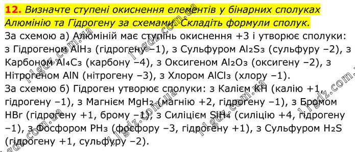 12. Визначте ступені окиснення елементів у бінарних сполуках Алюмінію та Гідрогену за схемами. Складіть формули сполук. За схемою а) Алюміній має ступінь окиснення +3 і утворює сполуки: з Гідрогеном AlH₃ (гідрогену –1), з Сульфуром Al₂S₃ (сульфуру –2), з Карбоном Al₄C₃ (карбону –4), з Оксигеном Al₂O₃ (оксигену –2), з Нітрогеном AlN (нітрогену –3), з Хлором AlCl₃ (хлору –1). За схемою б) Гідроген утворює сполуки: з Калієм KH (калію +1, гідрогену –1), з Магнієм MgH₂ (магнію +2, гідрогену –1), з Бромом HBr (гідрогену +1, брому –1), з Силіцієм SiH₄ (силіцію +4, гідрогену –1), з Фосфором PH₃ (фосфору –3, гідрогену +1), з Сульфуром H₂S (гідрогену +1, сульфуру –2).