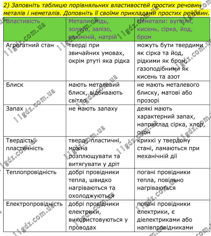 2) Заповніть таблицю порівняльних властивостей простих речовин металів і неметалів. Доповніть її своїми прикладами простих речовин. Властивість Метали: мідь, золото, залізо, алюміній, натрій Неметали: вугілля, кисень, сірка, йод, бром Агрегатний стан тверді при звичайних умовах, окрім ртуті яка рідка можуть бути твердими як сірка та йод, рідкими як бром, газоподібними як кисень та азот Блиск мають металевий блиск, відбивають світло не мають металевого блиску, матові або прозорі Запах не мають запаху деякі мають характерний запах, наприклад сірка, хлор, озон Твердість, пластичність тверді, пластичні, можна розплющувати та витягувати у дріт крихкі у твердому стані, ламаються при механічній дії Теплопровідність добрі провідники тепла, швидко нагріваються та охолоджуються погані провідники тепла, повільно нагріваються Електропровідність добрі провідники електрики, використовуються у проводах погані провідники електрики, є діелектриками або напівпровідниками