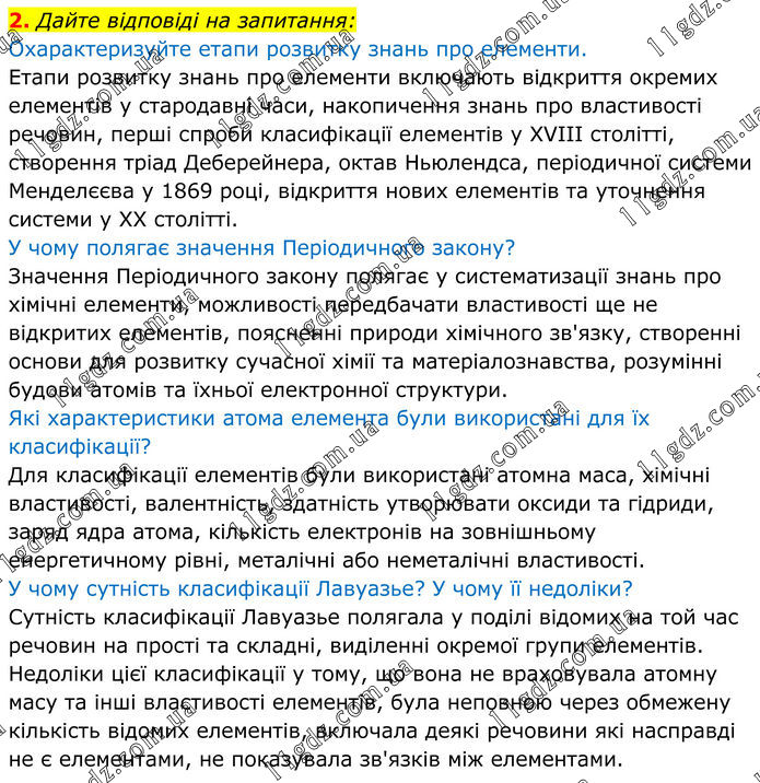 2. Дайте відповіді на запитання: Охарактеризуйте етапи розвитку знань про елементи. Етапи розвитку знань про елементи включають відкриття окремих елементів у стародавні часи, накопичення знань про властивості речовин, перші спроби класифікації елементів у XVIII столітті, створення тріад Деберейнера, октав Ньюлендса, періодичної системи Менделєєва у 1869 році, відкриття нових елементів та уточнення системи у XX столітті. У чому полягає значення Періодичного закону? Значення Періодичного закону полягає у систематизації знань про хімічні елементи, можливості передбачати властивості ще не відкритих елементів, поясненні природи хімічного зв'язку, створенні основи для розвитку сучасної хімії та матеріалознавства, розумінні будови атомів та їхньої електронної структури. Які характеристики атома елемента були використані для їх класифікації? Для класифікації елементів були використані атомна маса, хімічні властивості, валентність, здатність утворювати оксиди та гідриди, заряд ядра атома, кількість електронів на зовнішньому енергетичному рівні, металічні або неметалічні властивості. У чому сутність класифікації Лавуазье? У чому її недоліки? Сутність класифікації Лавуазье полягала у поділі відомих на той час речовин на прості та складні, виділенні окремої групи елементів. Недоліки цієї класифікації у тому, що вона не враховувала атомну масу та інші властивості елементів, була неповною через обмежену кількість відомих елементів, включала деякі речовини які насправді не є елементами, не показувала зв'язків між елементами.
