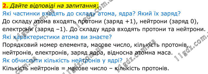 2. Дайте відповіді на запитання: Які частинки входять до складу атома, ядра? Який їх заряд? До складу атома входять протони (заряд +1), нейтрони (заряд 0), електрони (заряд –1). До складу ядра входять протони та нейтрони. Які характеристики атома ви знаєте? Порядковий номер елемента, масове число, кількість протонів, нейтронів, електронів, заряд ядра, відносна атомна маса. Як обчислити кількість нейтронів у ядрі? Кількість нейтронів = масове число – кількість протонів.