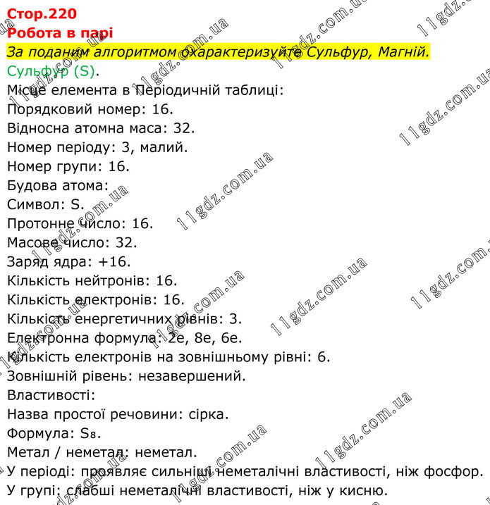 Робота в парі За поданим алгоритмом охарактеризуйте Сульфур, Магній. Сульфур (S). Місце елемента в Періодичній таблиці: Порядковий номер: 16. Відносна атомна маса: 32. Номер періоду: 3, малий. Номер групи: 16. Будова атома: Символ: S. Протонне число: 16. Масове число: 32. Заряд ядра: +16. Кількість нейтронів: 16. Кількість електронів: 16. Кількість енергетичних рівнів: 3. Електронна формула: 2e, 8e, 6e. Кількість електронів на зовнішньому рівні: 6. Зовнішній рівень: незавершений. Властивості: Назва простої речовини: сірка. Формула: S₈. Метал / неметал: неметал. У періоді: проявляє сильніші неметалічні властивості, ніж фосфор. У групі: слабші неметалічні властивості, ніж у кисню.