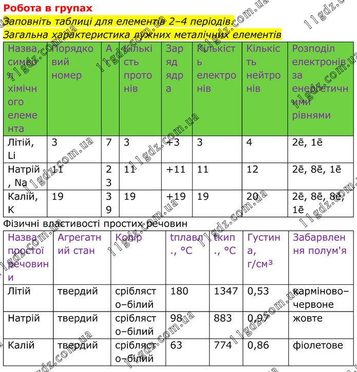 Робота в групах Заповніть таблиці для елементів 2–4 періодів. Загальна характеристика лужних металічних елементів