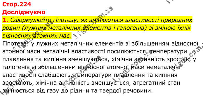 Досліджуємо 1. Сформулюйте гіпотезу, як змінюються властивості природних родин (лужних металічних елементів і галогенів) зі зміною їхніх відносних атомних мас. Гіпотеза: у лужних металічних елементів зі збільшенням відносної атомної маси металічні властивості посилюються, температури плавлення та кипіння зменшуються, хімічна активність зростає, у галогенів зі збільшенням відносної атомної маси неметалічні властивості слабшають, температури плавлення та кипіння зростають, хімічна активність зменшується, агрегатний стан змінюється від газу до рідини та твердої речовини.
