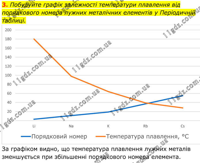 3. Побудуйте графік залежності температури плавлення від порядкового номера лужних металічних елементів у Періодичній таблиці. За графіком видно, що температура плавлення лужних металів зменшується при збільшенні порядкового номера елемента.