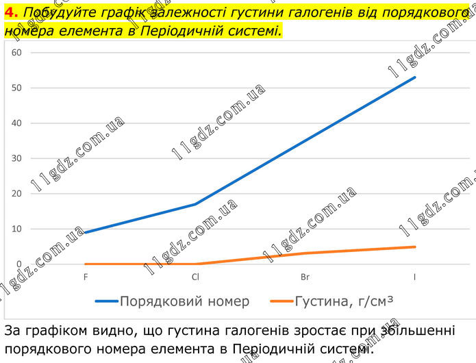 4. Побудуйте графік залежності густини галогенів від порядкового номера елемента в Періодичній системі. За графіком видно, що густина галогенів зростає при збільшенні порядкового номера елемента в Періодичній системі.