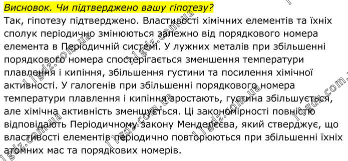 Висновок. Чи підтверджено вашу гіпотезу? Так, гіпотезу підтверджено. Властивості хімічних елементів та їхніх сполук періодично змінюються залежно від порядкового номера елемента в Періодичній системі. У лужних металів при збільшенні порядкового номера спостерігається зменшення температури плавлення і кипіння, збільшення густини та посилення хімічної активності. У галогенів при збільшенні порядкового номера температури плавлення і кипіння зростають, густина збільшується, але хімічна активність зменшується. Ці закономірності повністю відповідають Періодичному закону Менделєєва, який стверджує, що властивості елементів періодично повторюються при збільшенні їхніх атомних мас та порядкових номерів.