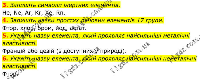 3. Запишіть символи інертних елементів. He, Ne, Ar, Kr, Xe, Rn. 4. Запишіть назви простих речовин елементів 17 групи. Фтор, хлор, бром, йод, астат. 5. Укажіть назву елемента, який проявляє найсильніші металічні властивості. Францій або цезій (з доступних у природі). 6. Укажіть назву елемента, який проявляє найсильніші неметалічні властивості. Фтор.