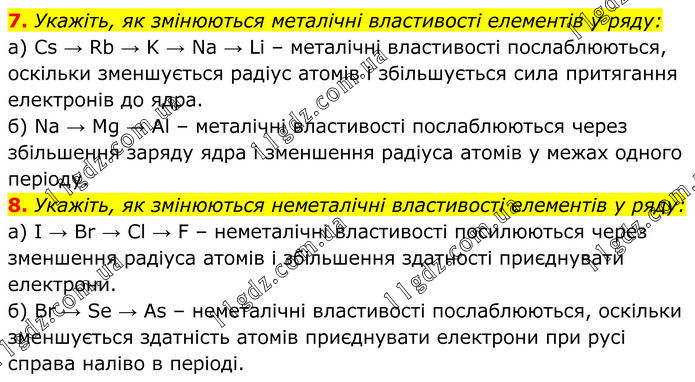 7. Укажіть, як змінюються металічні властивості елементів у ряду: а) Cs → Rb → K → Na → Li – металічні властивості послаблюються, оскільки зменшується радіус атомів і збільшується сила притягання електронів до ядра. б) Na → Mg → Al – металічні властивості послаблюються через збільшення заряду ядра і зменшення радіуса атомів у межах одного періоду. 8. Укажіть, як змінюються неметалічні властивості елементів у ряду: а) I → Br → Cl → F – неметалічні властивості посилюються через зменшення радіуса атомів і збільшення здатності приєднувати електрони. б) Br → Se → As – неметалічні властивості послаблюються, оскільки зменшується здатність атомів приєднувати електрони при русі справа наліво в періоді.