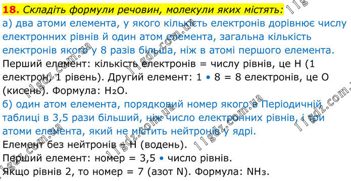 18. Складіть формули речовин, молекули яких містять: а) два атоми елемента, у якого кількість електронів дорівнює числу електронних рівнів й один атом елемента, загальна кількість електронів якого у 8 разів більша, ніж в атомі першого елемента. Перший елемент: кількість електронів = числу рівнів, це H (1 електрон, 1 рівень). Другий елемент: 1 • 8 = 8 електронів, це O (кисень). Формула: H₂O. б) один атом елемента, порядковий номер якого в Періодичній таблиці в 3,5 рази більший, ніж число електронних рівнів, і три атоми елемента, який не містить нейтронів у ядрі. Елемент без нейтронів – H (водень). Перший елемент: номер = 3,5 • число рівнів. Якщо рівнів 2, то номер = 7 (азот N). Формула: NH₃.