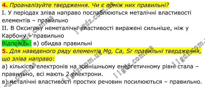 4. Проаналізуйте твердження. Чи є поміж них правильні? I. У періодах зліва направо послаблюються металічні властивості елементів – правильно II. В Оксигену неметалічні властивості виражені сильніше, ніж у Карбону – правильно Відповідь: в) обидва правильні 5. Для наведеного ряду елементів Mg, Ca, Sr правильні твердження, що зліва направо: а) кількість електронів на зовнішньому енергетичному рівні стала – правильно, всі мають 2 електрони. в) металічні властивості простих речовин посилюються – правильно.
