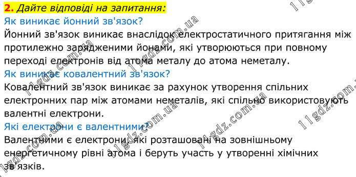 2. Дайте відповіді на запитання: Як виникає йонний зв'язок? Йонний зв'язок виникає внаслідок електростатичного притягання між протилежно зарядженими йонами, які утворюються при повному переході електронів від атома металу до атома неметалу. Як виникає ковалентний зв'язок? Ковалентний зв'язок виникає за рахунок утворення спільних електронних пар між атомами неметалів, які спільно використовують валентні електрони. Які електрони є валентними? Валентними є електрони, які розташовані на зовнішньому енергетичному рівні атома і беруть участь у утворенні хімічних зв'язків.