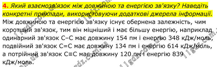 4. Який взаємозв'язок між довжиною та енергією зв'язку? Наведіть конкретні приклади, використовуючи додаткові джерела інформації. Між довжиною та енергією зв'язку існує обернена залежність, чим коротший зв'язок, тим він міцніший і має більшу енергію, наприклад одинарний зв'язок C–C має довжину 154 пм і енергію 348 кДж/моль, подвійний зв'язок C=C має довжину 134 пм і енергію 614 кДж/моль, а потрійний зв'язок C≡C має довжину 120 пм і енергію 839 кДж/моль.