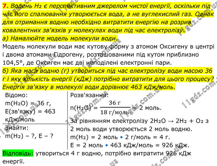 7. Водень H₂ є перспективним джерелом чистої енергії, оскільки під час його спалювання утворюється вода, а не вуглекислий газ. Однак для отримання водню необхідно витратити енергію на розрив ковалентних зв'язків у молекулах води під час електролізу. а) Намалюйте модель молекули води. Модель молекули води має кутову форму з атомом Оксигену в центрі і двома атомами Гідрогену, розташованими під кутом приблизно 104,5°, де Оксиген має дві неподілені електронні пари. б) Яка маса водню (г) утвориться під час електролізу води масою 36 г і яку кількість енергії (кДж) потрібно витратити для цього процесу? Енергія зв'язку в молекулі води дорівнює 463 кДж/моль. Відомо: m(H₂O) = 36 г, E(зв'язку) = 463 кДж/моль Розв'язання: n(H₂O) = (36 г )/(18 г/моль ) = 2 моль. За рівнянням електролізу 2H₂O → 2H₂ + O₂ з 2 моль води утворюється 2 моль водню. m(H₂) = 2 моль • 2 г/моль = 4 г. E = 2 моль • 463 кДж/моль = 926 кДж. Знайти: m(H₂) – ?, E – ? Відповідь: утвориться 4 г водню, потрібно витратити 926 кДж енергії.