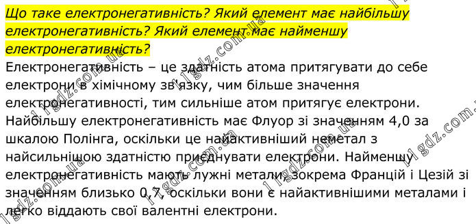 Що таке електронегативність? Який елемент має найбільшу електронегативність? Який елемент має найменшу електронегативність? Електронегативність – це здатність атома притягувати до себе електрони в хімічному зв'язку, чим більше значення електронегативності, тим сильніше атом притягує електрони. Найбільшу електронегативність має Флуор зі значенням 4,0 за шкалою Полінга, оскільки це найактивніший неметал з найсильнішою здатністю приєднувати електрони. Найменшу електронегативність мають лужні метали, зокрема Францій і Цезій зі значенням близько 0,7, оскільки вони є найактивнішими металами і легко віддають свої валентні електрони.